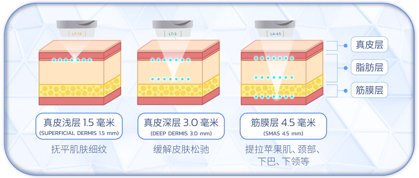- 使用可视化微聚焦超声波技术(MFU-V)设计个性化治疗方案,将声波能量传递到不同深度的皮肤层,医生可以观察到每一层皮肤,并精准处理皮肤问题。
